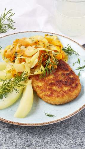 Burger de cabillaud et duo de tagliatelles de légumes