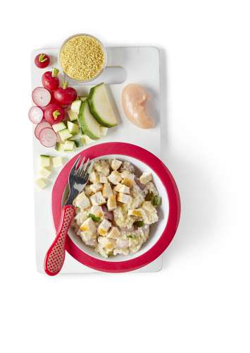 - 4 Coupez la volaille et les légumes en petits morceaux, et mélangez le tout.