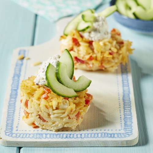 - Un voyage dans les îles ioniennes, ça se prépare : ces bouchées salées se composent de pâtes et de légumes. Sors donc une planche et un petit couteau pour le travail de découpe.