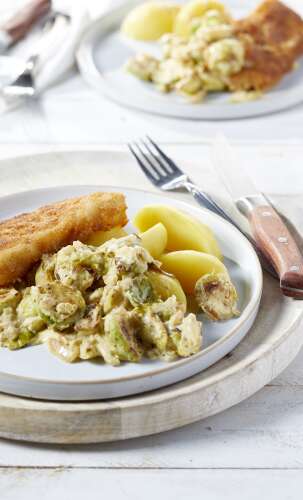 Dos de cabillaud pané et choux de Bruxelles à la crème