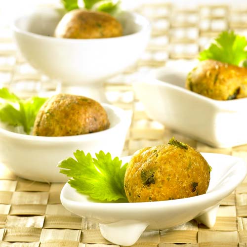 - Faites chauffer l'huile dans une petite poêle (il doit y avoir 1 cm d'huile) et faites-y cuire les boulettes pendant 2 min de chaque côté, ou plongez-les dans la friteuse (170 °C). Laissez égoutter sur de l'essuie-tout.