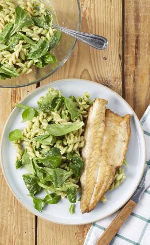 Filet de bar poêlé et spirellis complets aux petits pois et à la salade de blé
