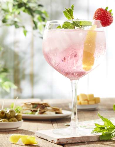 2 Ajoutez le gin, puis le tonic. Garnissez avec la menthe et la fraise.