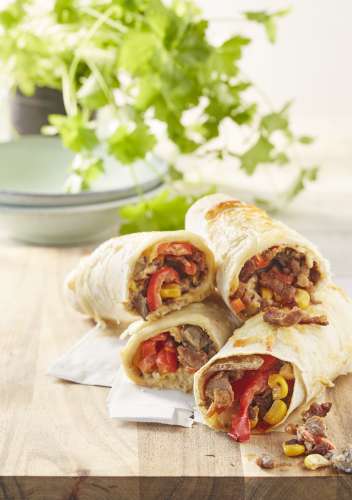 - 5 Répartissez la viande sur les wraps et roulez-les. Placez-les dans un plat four, avec le pli vers le bas. Couvrez de fromage râpé et glissez 3 à 5 min sous le gril du four.