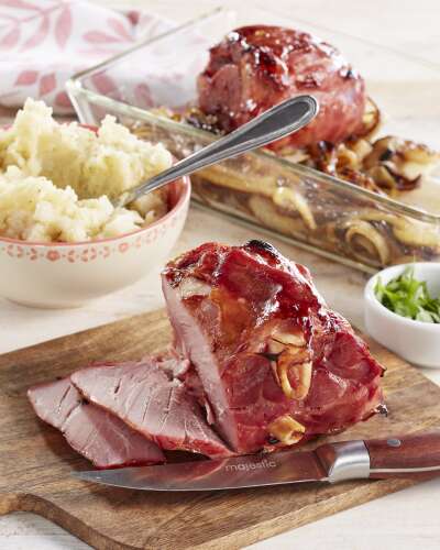 Jambonneau laqué à l’orange, purée au céleri-rave et oignons caramélisés