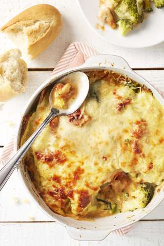 - 5 Graissez un plat à four avec 1 c. à café d’huile d’olive et déposez-y la moitié des brocolis. Nappez avec 1/3 de la sauce, couvrez de rubans de courgette, puis de la moitié des champignons. Répétez l’opération en terminant par le reste de la sauce. Parsemez de fromage râpé.