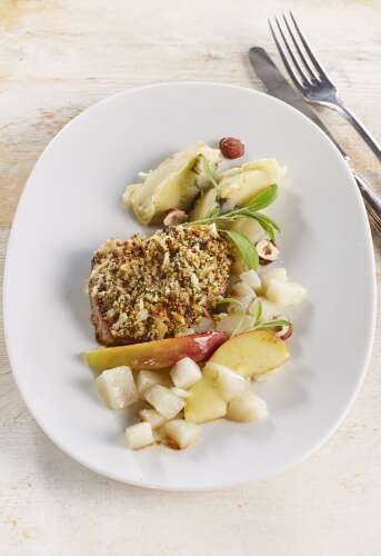 Médaillon de veau au crumble et topinambours aux pommes