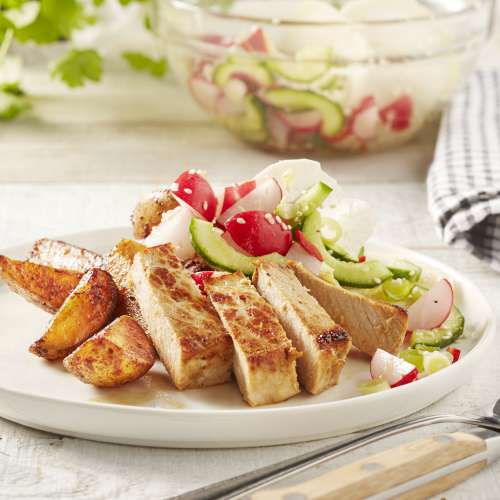 Coupez la viande en tranches obliques. Servez-les avec les pommes de terre rissolées et la salade de radis noir.