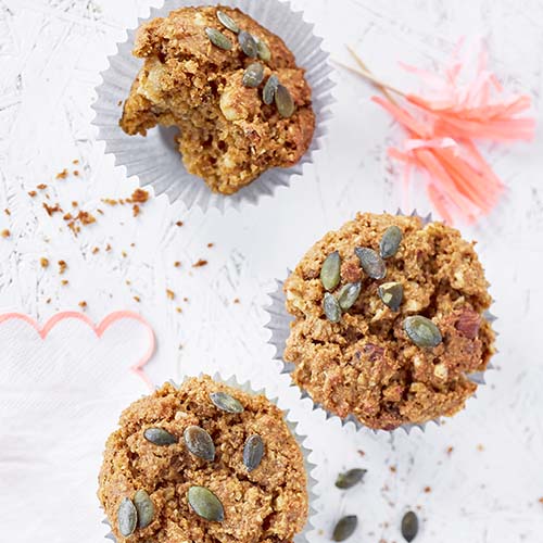 - 7 Déposez 10 à 12 formes en papier dans les compartiments d’un moule à muffins et remplissez-les de pâte jusqu’au bord. Parsemez de graines de potiron.
