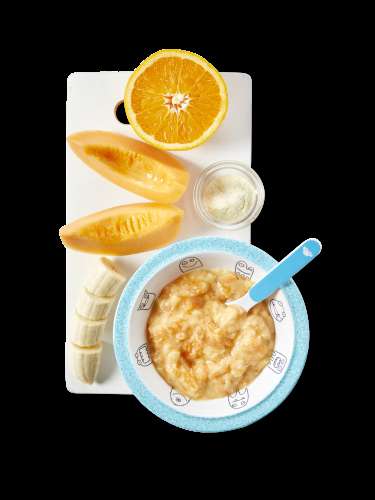 - 2 Écrasez ou mixez la demi-banane avec la chair du melon et les céréales biscuitées. Mélangez-y le jus d’orange.