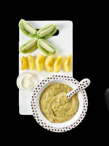 - 2 Écrasez les fruits ou mixez-les avec les céréales biscuitées.