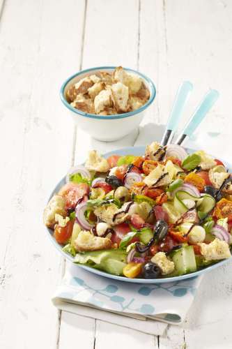 - 4 Présentez les minilaitues et les rubans de concombre sur un plat. Répartissez-y la salade de tomates, les olives, les billes de mozzarella et la moitié des croûtons. Salez et poivrez.