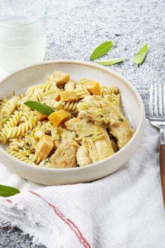 - 4 Arrosez de crème et de bouillon, et prolongez la cuisson de 10 min. Intégrez la volaille et la sauge pour les 2 dernières minutes de cuisson. Mélangez la préparation avec les pâtes.