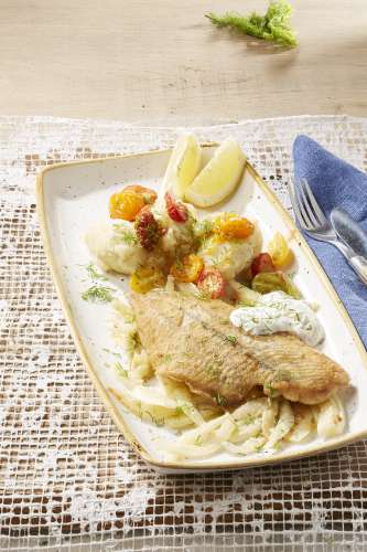 Répartissez le fenouil sur les assiettes et déposez-y le poisson. Ajoutez de la purée à côté et des tomates cerises grillées. Décorez avec le vert de fenouil restant, de la crème épaisse et 1 quartier de citron.