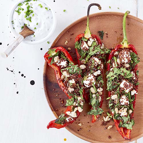 - 4 Garnissez les poivrons de farce au quinoa et déposez-les sur une plaque de four tapissée de papier cuisson. Glissez-les 5 min sous le ril du four jusqu’à ce que la feta fonde.