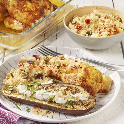 Poulet et aubergines au four, couscous à la méridionale