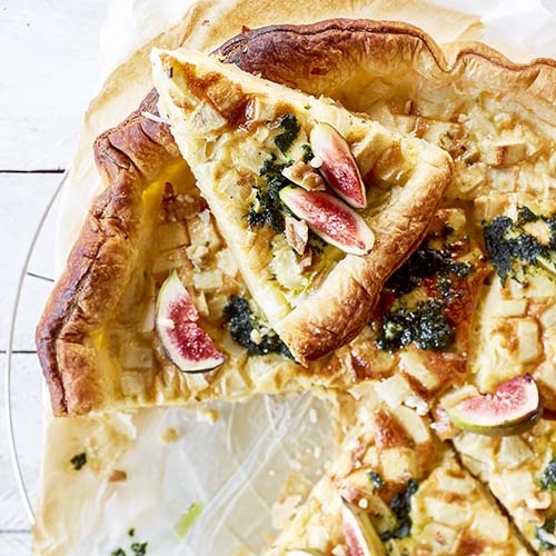 Sortez la quiche du four et décorez-la avec les figues, les noix et le coulis de fines herbes.