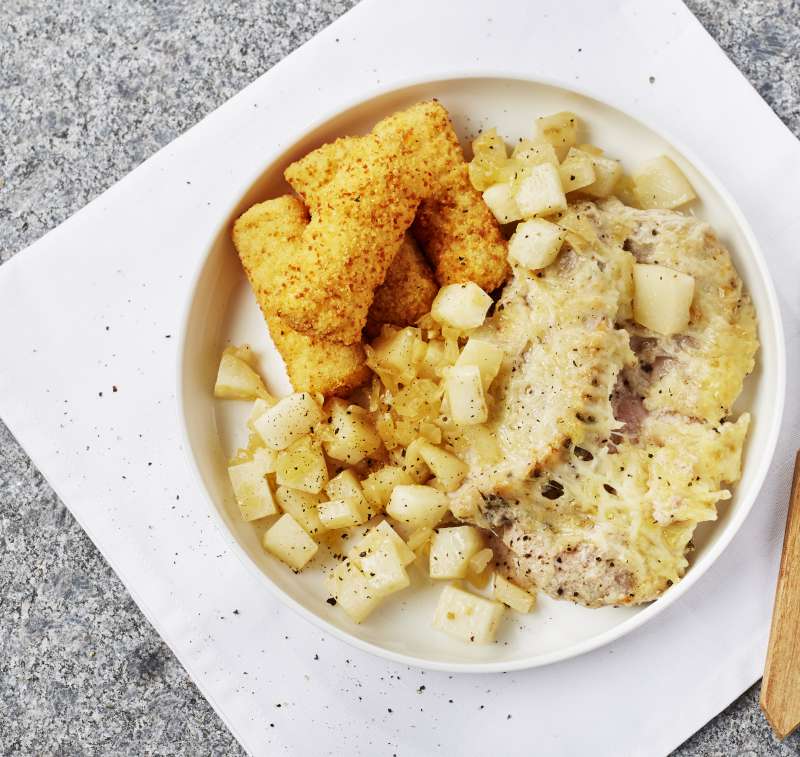 Rôti de porc gratiné, purée de champignons et chou-rave étuvé