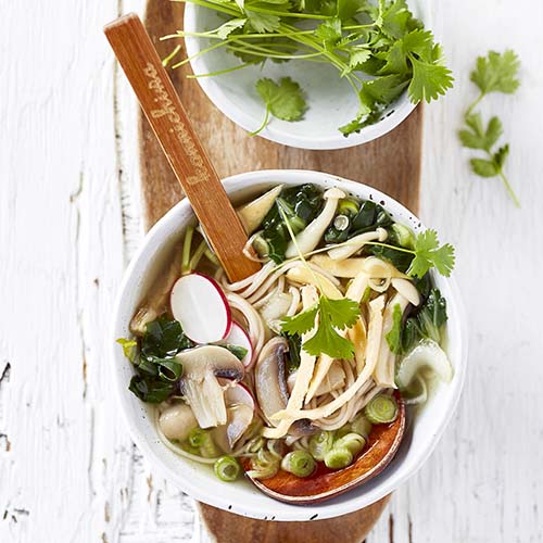 - 5 Répartissez les nouilles, les radis et les jeunes oignons dans 4 grands bols. Versez le bouillon aux champignons par-dessus. Garnissez avec les lanières d’omelette et la coriandre.