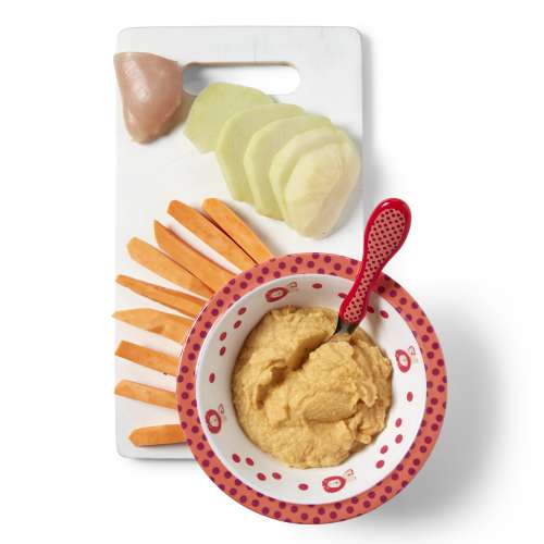1 Faites cuire les dés de chou-rave et de patate douce 15 min dans de l’eau bouillante. Ajoutez le poulet pour les 5 dernières minutes de cuisson. Égouttez.