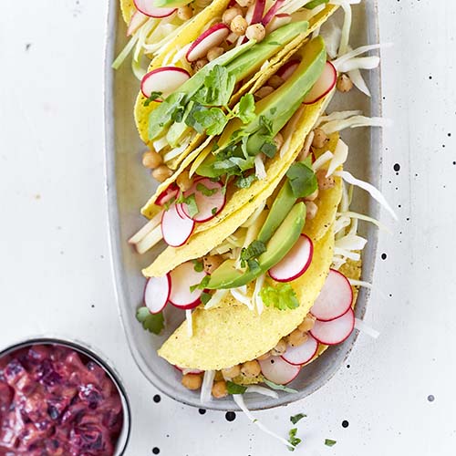 - 5 Farcissez les tacos de salade de chou, d’avocat, de pois chiches et de persil plat. Servez avec la raïta aux betteraves rouges.
