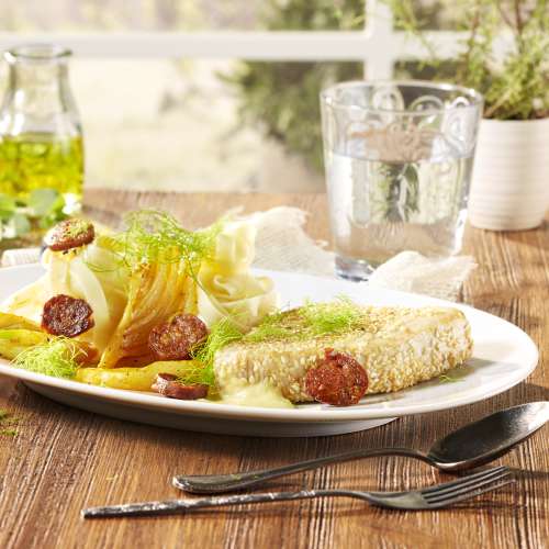 - 4 Faites chauffer l’huile d’olive dans une poêle et dorez-y les rondelles de chorizo 1 min. Réservez hors de la poêle et faites revenir le fenouil à la place 2 à 3 min. Salez et poivrez, et réservez hors de la poêle.
